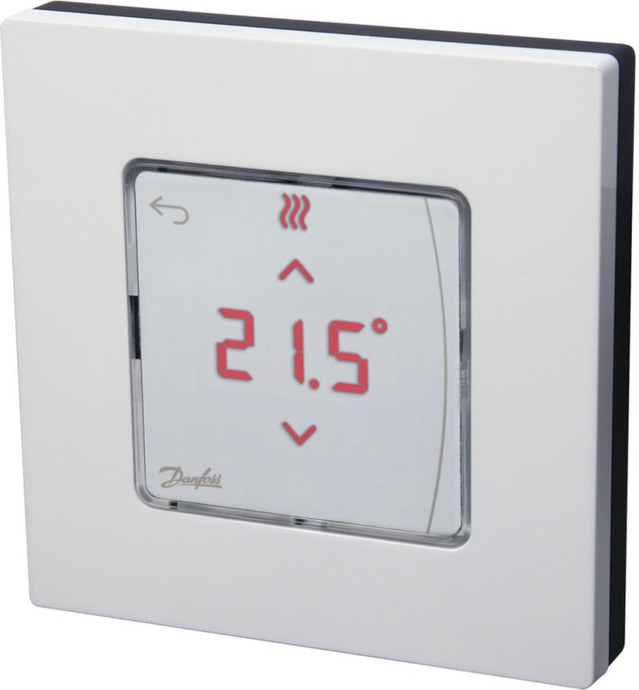 Danfoss Raumthermostat Icon 230V mit Display, Aufputz, 088U1015Danfoss Icon™ bietet eine Reihe von Raumthermostaten für Warmwasser-Fußbodenheizungen, die sowohl für die Unter- als auch die Aufputzmontage geeignet sind. Die Display-Version von Danfoss Icon ist eine 230-V-Ausführung, die entweder als Stand-alone-Regler oder in Kombination mit dem Hauptregler 088H0016 genutzt werden kann. Über den Triac-Ausgang können bis zu fünf thermische Stellantriebe angesteuert werden. Der Thermostat ermöglicht es dem Benutzer, die gewünschte Raumtemperatur über einen Touchscreen einzustellen und die gemessene Temperatur abzulesen. Das Bedienfeld besteht aus einem glasähnlichen Material und verfügt über ein hintergrundbeleuchtetes LED-Display. Im normalen Betrieb ist das Display ausgeschaltet.Produktmerkmale:Präzise PWM-Steuerung (Pulsweitenmodulation) • Unterputzversion mit handelsüblichen Rahmenprogrammen vieler Hersteller kompatibelDisplay mit HintergrundbeleuchtungBegrenzung der Mindest- und Maximaltemperatur über das BenutzermenüModernes Design und einfache BedienoberflächeFrostschutzfunktionVerwendbar mit NC- oder NO-Stellantrieben (230 V)Thermostat über das Servicemenü für verschiedene Wärmequellen optimierbarAntiblockierfunktion der VentileSehr hohe UV-BeständigkeitTechnische Daten:Typ: Elektronischer Thermostat mit Touchscreen- BedienfeldBedienoberfläche: Kapazitiver Touchscreen mit hintergrundbeleuchteter AnzeigeFunktionen der Bedienoberfläche: Heizungssymbol, Pfeile nach oben/nach unten, Bestätigungstaste, ZurücktasteAnzeigetyp Hybrid: rote Einzel-LED und benutzerdefinierter BereichAnzeigemerkmale: Schaltet sich nach 10 Sek. ohne Bedienung AUSTemperaturbereich: 5 bis 35° C (Frostschutzeinstellung = 5° C)Umgebungstemperatur, Lagerung: -20 bis 60° CUmgebungstemperatur für die Anwendung: 0 bis +40° CRegler, Typ: Anpassbare PulsweitenmodulationMax. Dauerlast (Ausgang): < 50 mA/10 W (= 5 Danfoss TWA-Stellantriebe)Max. Einschaltstrom (Stellantrieb): 3 A ≤ 100 msLeistungsaufnahme: 0,2 WSpannungsversorgung (ohne Stellantriebe): 220 bis 240 V, 50/60 HzRaumfühler: NTC 47 kΩGehäusematerial Weiße Teile: PC ASAGraue Teile: PC, 10 % GlasIP und Schutzart IP: 21 Schutzklasse: IIErP-Klasse: ErP4 (2 %)Zulassung: CE, RohS, WEEEFarbe: Weiß RAL9010/Dunkelgrau RAL7024Abmessungen: 86 x 86 x 25 mm1x Danfoss Icon 230V Raumthermostat mit Display