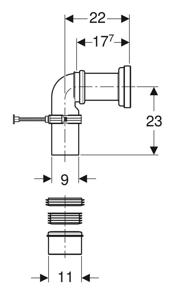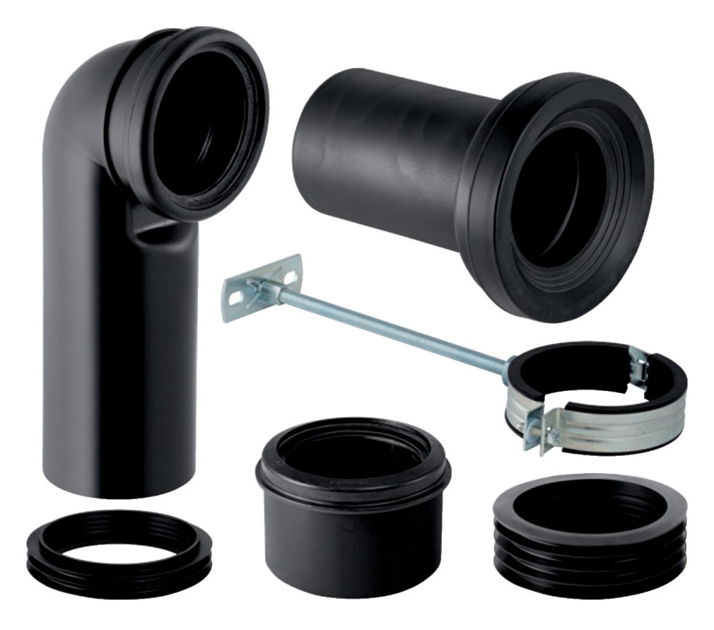 Geberit Set Anschlussbogen 90° für Stand-WC 131.082.16.1- Manschette aus EPDM- Anschlussstutzen aus PE-HD, Ø 90 mm- Übergangsmuffe aus PE-HD, Ø 90/110 mm- Befestigungsmaterial