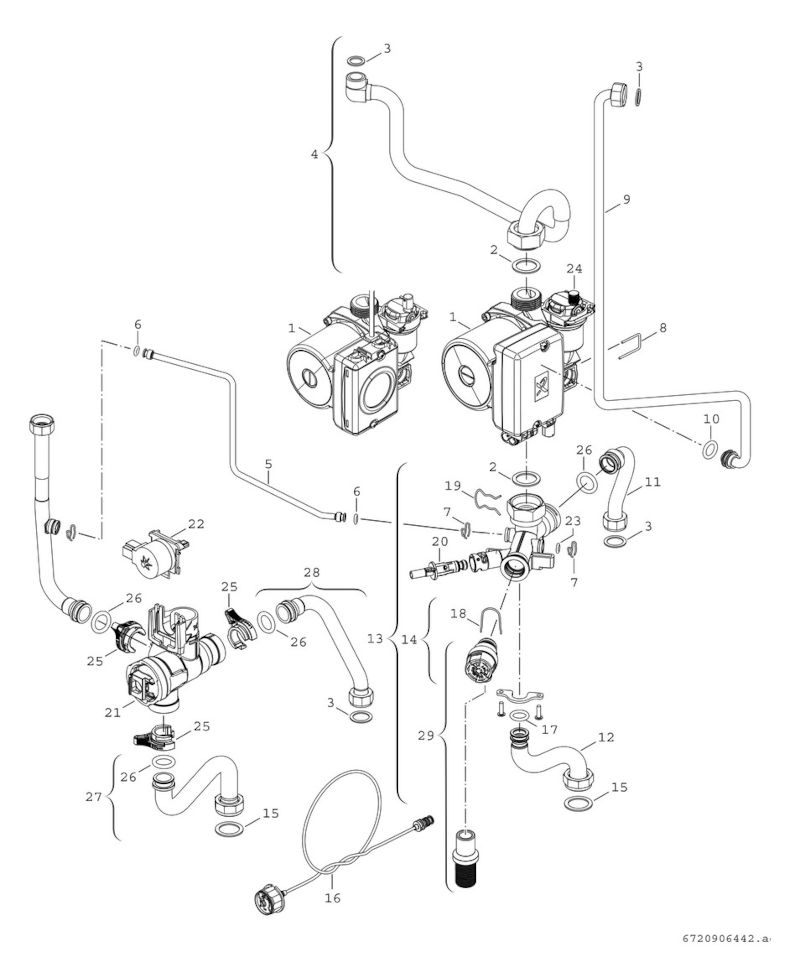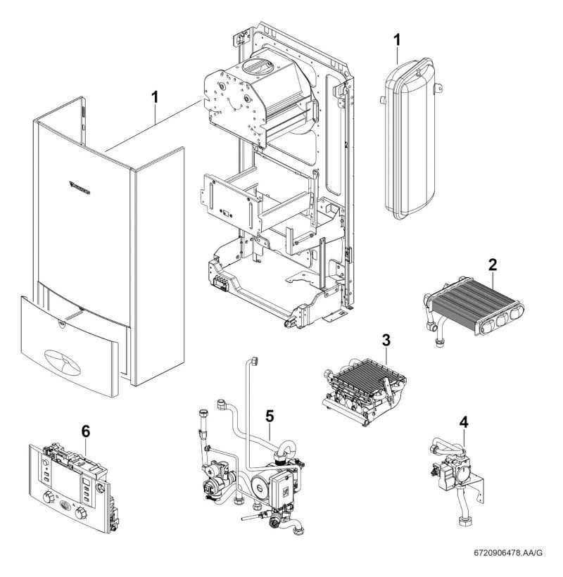 Ausdehnungsgefäß, drehzahlgeregelte Umwälzpumpe, automatischer Schnellentlüfter, Manometer, Sicherheitsventil, Temperaturbegrenzer in 24 V DC Stromkreis. LED-Multifunktionsanzeige für Vorlauftemperatur und Betriebszustände. Steuergerät: Bosch Heatronic 3, BUS-fähig. Abgasüberwachung AGÜ.